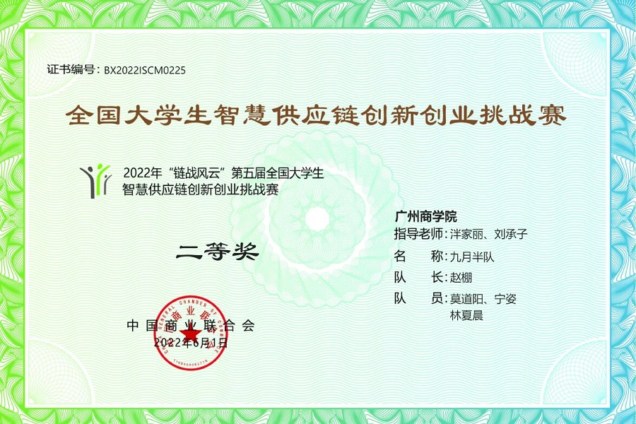 近日,由中国商业联合会主办、上海颐禾教育科技有限公司及中国商业联合会商业职业技能鉴定指导中心承办的 “链战风云”第五届全国老员工智慧供应链创新创业挑战赛落下帷幕。由公司伟德betvlctor1949源于英国泮家丽、刘承子老师指导的物流管理专业赵棚、宁姿、莫道阳、林夏晨组成的“九月半”队斩获挑战赛初赛二等奖以及决赛铜奖。