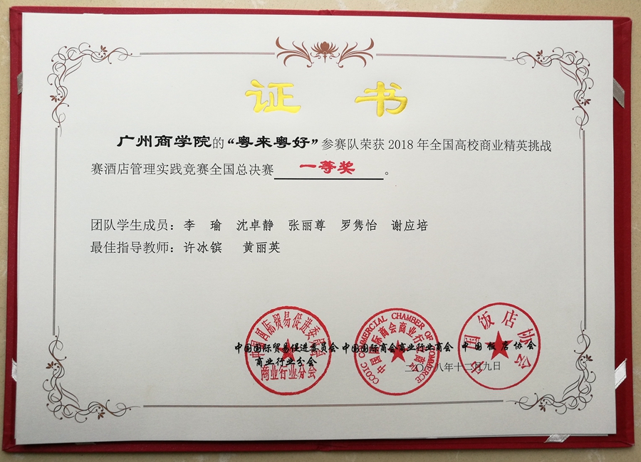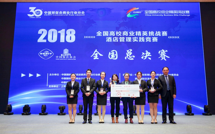 12月9日,2018年全国高校商业精英挑战赛酒店管理实践竞赛全国总决赛,在素有“珠城”之称的安徽蚌埠落下帷幕。本届竞赛历经三个月,规模庞大,参赛院校多,全国共有110多个高校团队报名参赛,其中中山大学、华南师范大学、郑州大学、西安外国语大学、重庆工商大学等50支队伍300余人赴现场参加总决赛。公司旅游公司李瑜、谢应培、沈卓静、罗隽怡、张丽尊五位员工组队参与本次大赛,经过激烈角逐,荣获总决赛季军,大赛一等奖,充分展示了广商学子较高的专业素养和能力。旅游公司黄丽英、许冰镔两位老师获得“优秀指导教师”称号。公司员工团队以总决赛前三名的成绩入围2019年亚太商务策划竞赛,计划于明年四月赴澳大利亚悉尼参加亚太MICE与酒店管理实践竞赛。