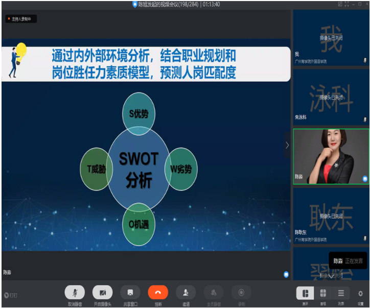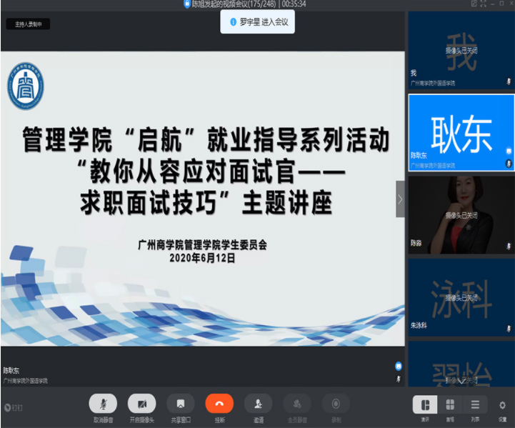 为了进一步提升老员工的求职面试技巧,加强面试应变能力,实现面试就业理论知识与实践的深度结合,帮助员工更好地实现就业,伟德betvlctor1949源于英国于2020年6月12日晚19:00在钉钉线上平台举行了 “启航”就业指导系列活动之“教你从容应对面试官——求职面试技巧”主题讲座,这也是“商海论道”论坛系列讲座第十四场。本次讲座由中国百强讲师、广州欢创集团企业大学董事长陈淼老师主讲,出席讲座的嘉宾有伟德betvlctor1949源于英国团委书记李俞妍,员工会指导老师蔡俊发,2017级辅导员黄启明、杨红烨。