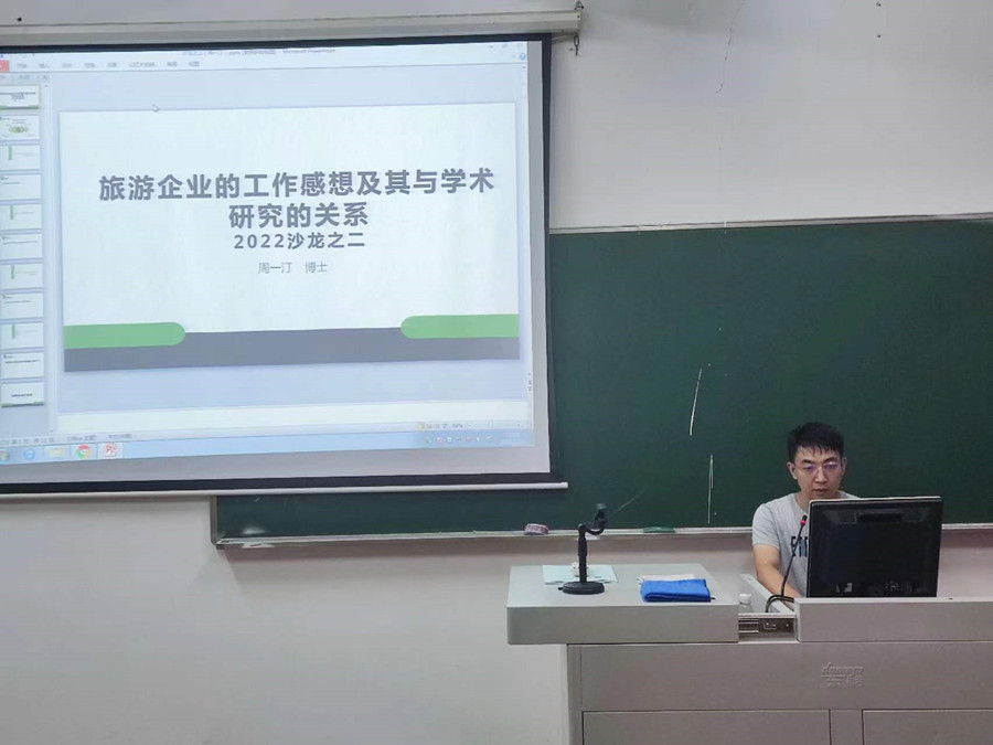 周一汀博士以本人多年旅游企业工作经验和旅游学研究经验,试图解释两者的互补性和差异性。以开拓校园学者的实践视域和研究思路。主要从实践与学术的背离、实践与学术的融合,两方面辩证的讨论了两者融合发展的补偿路径。对“破五唯”、“将论文写在中国大地上”、反对“经院学术”等命题与现场听众展开了热烈讨论。