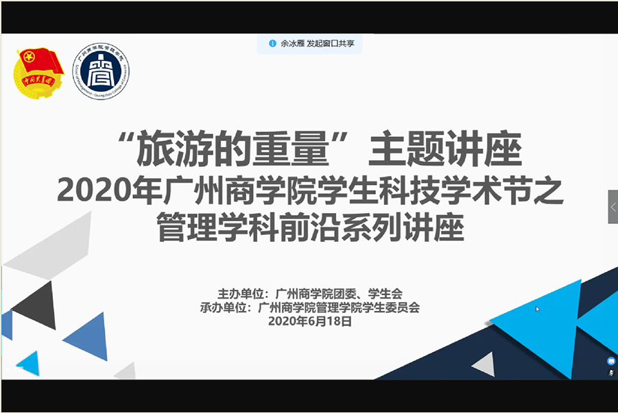 为促进同学们对旅游管理专业知识与实践的融合,拓宽同学们在旅游管理专业方面的视野,进一步提高同学们的专业素养,伟德betvlctor1949源于英国于2020年6月18日晚上19:00在线上平台举行了2020年www.betvlctor1946.com员工科技学术节管理学科前沿系列之“旅游的重量”主题讲座。本次讲座由广州自我游网络科技有限公司董事长列晓明主讲,出席本次讲座的嘉宾有伟德betvlctor1949源于英国老师方贤珊、16、18级辅导员刘智莹、17级辅导员黄启明。
