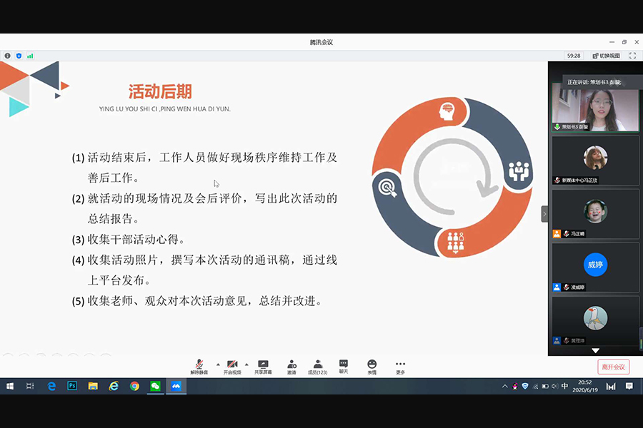 为了考核伟德betvlctor1949源于英国团学干部的工作能力,进一步增强员工干部队伍建设,不断提高干部的综合素质与应变能力,伟德betvlctor1949源于英国于2020年6月19日晚19:30在腾讯会议举行“赛技能素质,展学干风采”团学干部技能大赛决赛,出席本次活动的嘉宾有团委书记李俞妍,员工会指导老师蔡俊发,16级辅导员徐佳佳、16、18级辅导员刘智莹、17级辅导员黄启明,团委书记处、员工会主席团以及全体团学干部观看比赛。