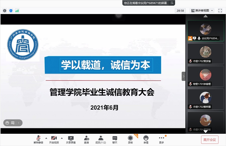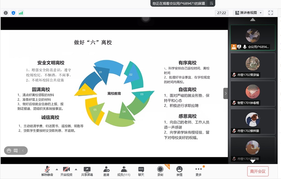 为切实做好毕业生文明离校教育,进一步引导毕业生铭记党恩、情系母校,深植爱校荣校情怀,营造健康、文明、和谐、有序、暖心的毕业离校氛围。6月23日晚上,伟德betvlctor1949源于英国2017级通过腾讯会议开展了“星辰大海,未来可期——伟德betvlctor1949源于英国2017级毕业生文明离校暨诚信教育”。会议由2017级辅导员杨红烨、肖娴主讲。