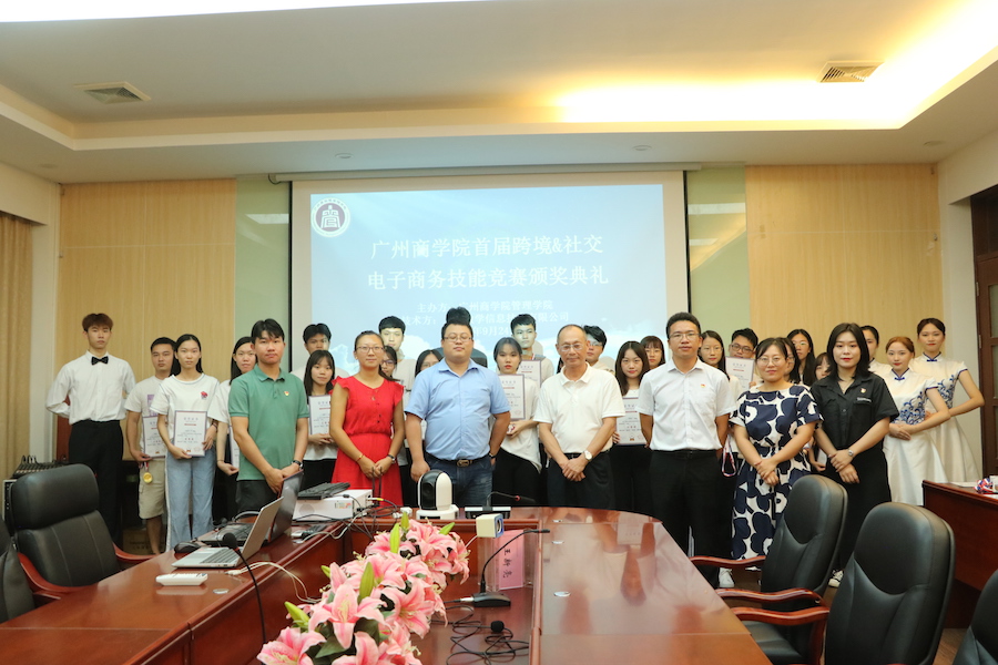 颁奖环节中,与会嘉宾为获奖选手颁发荣誉证书与奖品,并与选手合影留念。此次比赛中获奖队伍分别是:跨境电商竞赛一等奖白金汉队,二等奖Tom and Jerry队和X战队,三等奖皮卡丘小分队、淡萝卜队和夸克经济队,优秀奖Super CT队等队伍;社交电商竞赛一等奖胡少君、周心敏团队,二等奖赖晓茹、李玉妹、陈燕燕团队和黄海琳、魏智灏、沈煜彬团队,三等奖陈耿聪、张俊锐、陈旭源等团队;优秀奖白迅文、郑文婷、李文浩等团队。