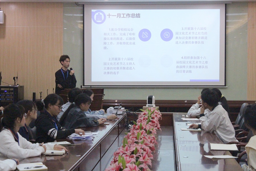 会议伊始,湛国维带领成员们共同学习党的十九届六中全会精神,深入理解党领导人民创造的“四个伟大成就”,党百年奋斗的“五大历史意义”和 “十个坚持”宝贵经验,深刻感悟全会的重大的政治意义、历史意义和时代意义。他鼓励成员们要强化“以史为鉴、开创未来”的历史担当,把党的创新理论融入实践,在工作中做到有担当、有作为,真抓实干,勇毅前行。各部门成员结合自身学习、生活和工作的实际进行心得分享。随后,各部门依次进行工作汇报,深刻总结与反思十一月份的工作情况并制定了十二月份的工作计划。紧接着,罗玉珍进行工作总结,她强调员工会工作人员需深入开展学习《关于推动高校员工会(研究生会)深化改革的若干意见》以及《关于学联员工会工作人员改进作风服务同学的若干规定》等文件精神,加强员工会组织作风建设,推动员工会改革不断深化,展现清新阳光的组织形象。