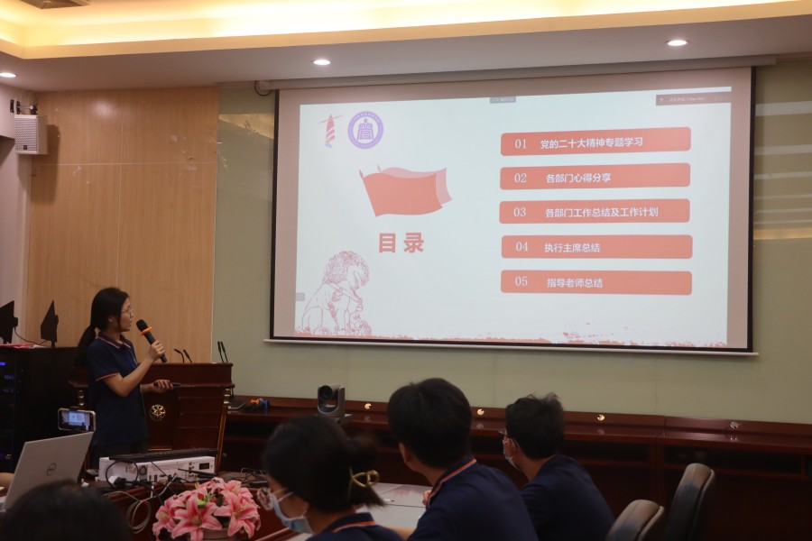 会议伊始,徐婷渲带领员工会工作人员学习了习近平在党的二十大开幕会上的讲话精神,她从二十大主题及内容概述、伟大变革、三件大事、新境界和使命任务等方面进行领学,她鼓励成员们立志做有理想、敢担当、能吃苦、肯作为的新时代青年,以身作则,严于律己,充分发挥榜样作用,服务同学更好的成长成才。各部门成员对此次讲话精神进行了学习并在会上分享了个人心得。随后,各部门依次汇报了十月份工作总结及十一月份工作计划。姚梦雨对此次会议进行总结及十一月工作部署。他强调各部门在完成本部门日常工作的同时也要从各方面严格要求自己,提高政治修养、稳固学业成绩、优化工作作风、端正工作态度,做到凡事有交代,件件有落实,事事有回应。
