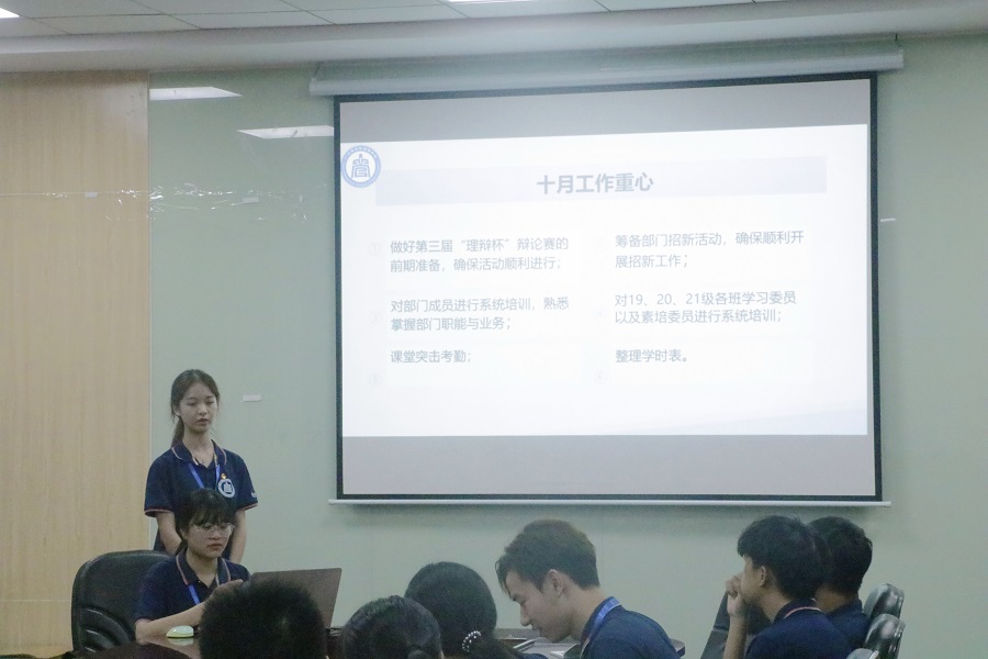 会议伊始,颜佳珈带领全体工作人员学习习近平总书记“七一”重要讲话精神。她围绕着“一个主题”、“四个伟大成就”、“四个庄严宣告”以及“九个必须”的理论亮点展开对于重要讲话内容的学习,她表示成员们在学习理论上,应真正做到学深悟透、融会贯通、真信笃行,做到学、思、用贯通,知、信、行统一,从而不断提高政治理论修养以及做好工作的本领和能力。各部门在会上结合思想和工作实际,交流学习心得。紧接着,各部门依次对九月份的工作进行汇报,深刻总结与反思九月份的工作情况并且制定了十月份的工作计划。湛国维针对近期工作情况指出工作中的不足之处并提出了计划存在的不足之处并提出建设性的意见和补充。