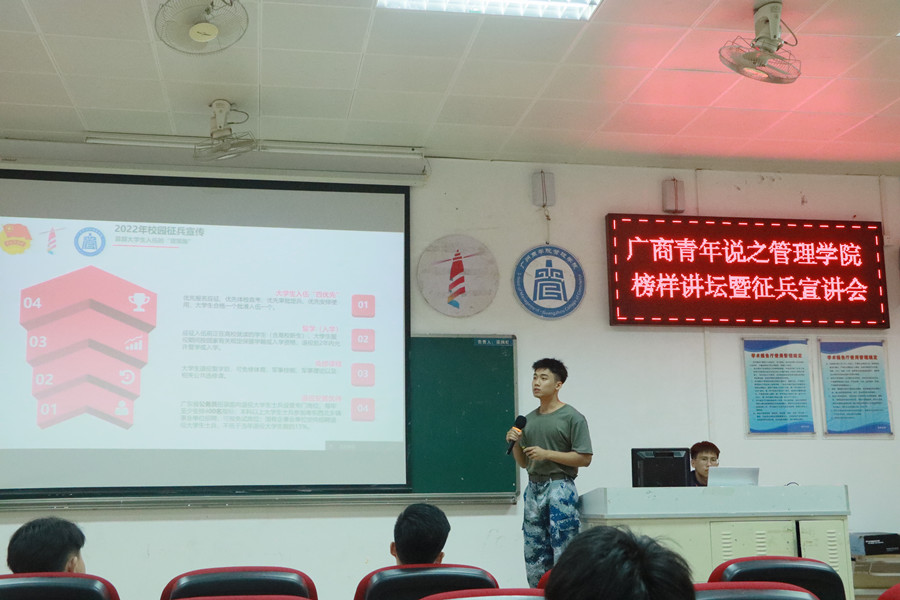 为帮助同学们拓宽就业思路,明确就业方向与目标,同时做好老员工征兵入伍宣传工作,鼓励老员工积极应征入伍。6月19日晚上19:00,伟德betvlctor1949源于英国在第四教学楼第二报告厅开展了“百年奋进正芳华,筑梦青春向未来”广商青年说之伟德betvlctor1949源于英国榜样讲坛暨征兵宣讲会。出席本次活动的嘉宾有员工会指导老师蔡俊发、2019级专升本辅导员黄华科以及各二级公司员工工作人员代表。
