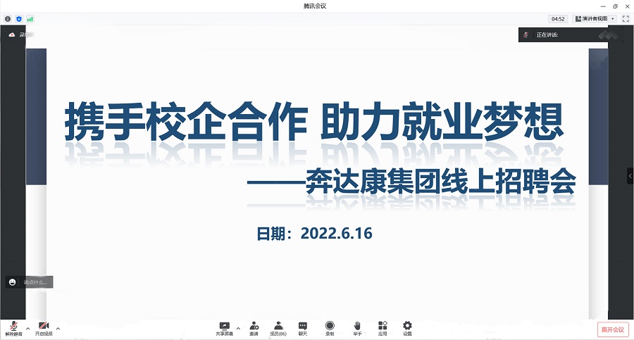 奔达康集团HR首先就企业概况、企业业务、企业文化、人员需求、员工晋升机制等多方面内容进行介绍。其次,结合当前社会严峻复杂的疫情防控形势和就业环境,分析了毕业生的就业形势,表示将通过多种形式开展合作,与公司共同推进2022届、2023届员工就业工作。最后,表示公司是值得信赖的公司单位,奔达康集团也会给员工们提供稳健发展的薪酬和全面的福利保障,非常希望能够引进我系学子,为企业的发展注入活力。