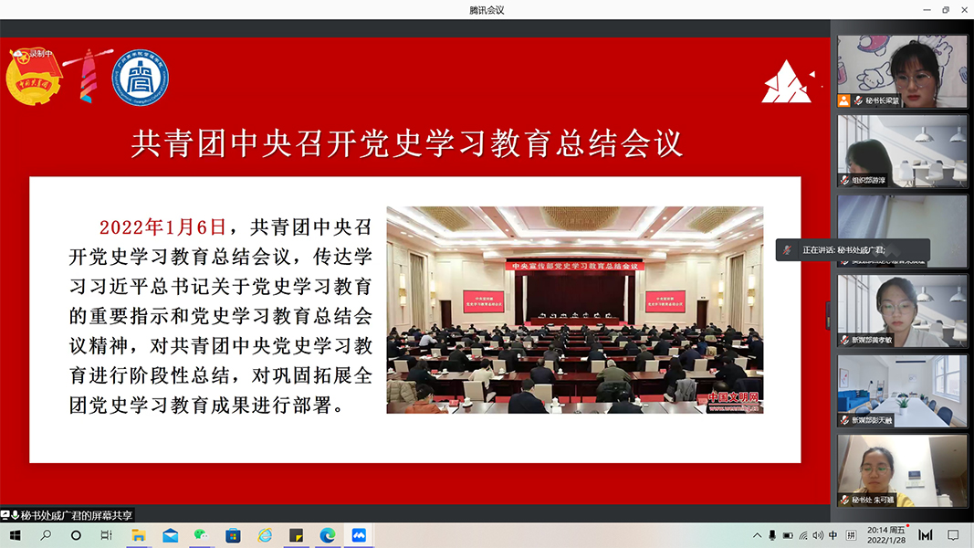为深入学习贯彻共青团中央党史学习教育总结会议精神,不断巩固拓展党史学习教育成果。1月28日晚,伟德betvlctor1949源于英国团委于腾讯会议组织团委全体工作人员开展共青团中央党史学习教育总结会议精神专题学习会暨百年循迹第十二讲,参与本次会议的有团委书记李俞妍及伟德betvlctor1949源于英国团委全体成员。