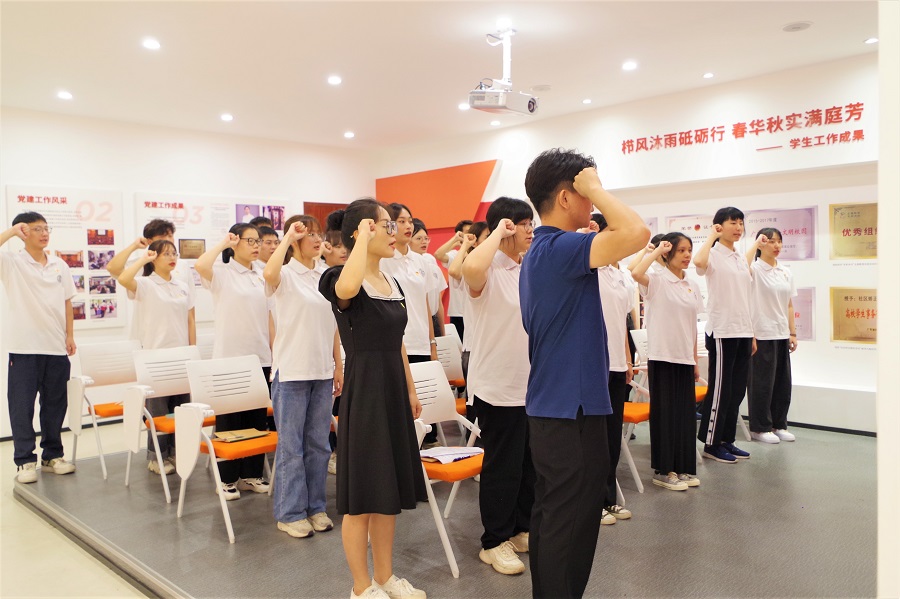在学习过程中,党员同志认真学习并做好笔记。学习后,大家进行了学习心得交流,黄楚瑶和林子豪等同志就此次学习分享心得感想,黄楚瑶表示作为一名预备党员,需要坚持党的领导,做到心系百姓,用行动维护好人民赖以生存的生态环境。林子豪表示我们应该积极落实国家的碳达峰和碳中和政策,要尽量选择低碳出行和做到一水多用以及光盘行动,为生态环境保护贡献力量。随后,党务工作组负责人依次作近期工作总结汇报,潘慧颖作支部党史学习教育工作推进计划的汇报。现场由支部正式党员对28名新发展预备党员授予党徽,并亲手佩戴。蔡俊发带领支部全体党员在公司“四史”馆进行入党宣誓。