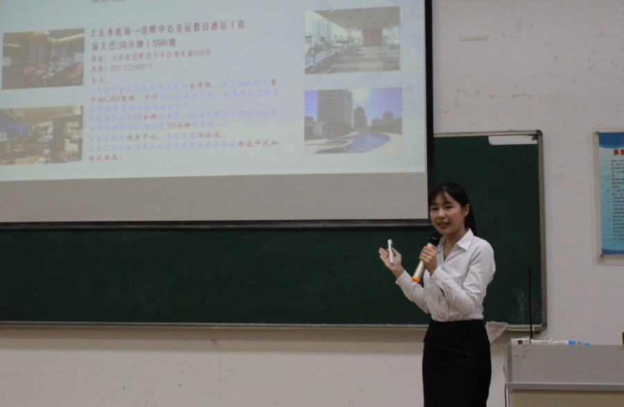 第四组黄泳欣、何佩恩的《香港3天2晚》从一名追星的角度着手介绍,新颖有趣,同时香港的美妙并不只是在于它的夜景与美食,而是在于舒适和美好,为同学们展示香港的另一面。第五组何嘉慧的《台湾放飞之旅》让我们感受到它独特的魅力,参观各种各样的教堂,穿梭狭窄的小巷,领略异地风情,了解台湾的风俗习惯。第六组邓雅玟,七林拉姆《云南旅游攻略》角度更加新颖,为特定人群设计路线,点明是为情侣、夫妻设计的一款蜜月旅行,为他们介绍极具民族色彩的云南,体验少数民族的民族风情,极其吸引当代年轻人。