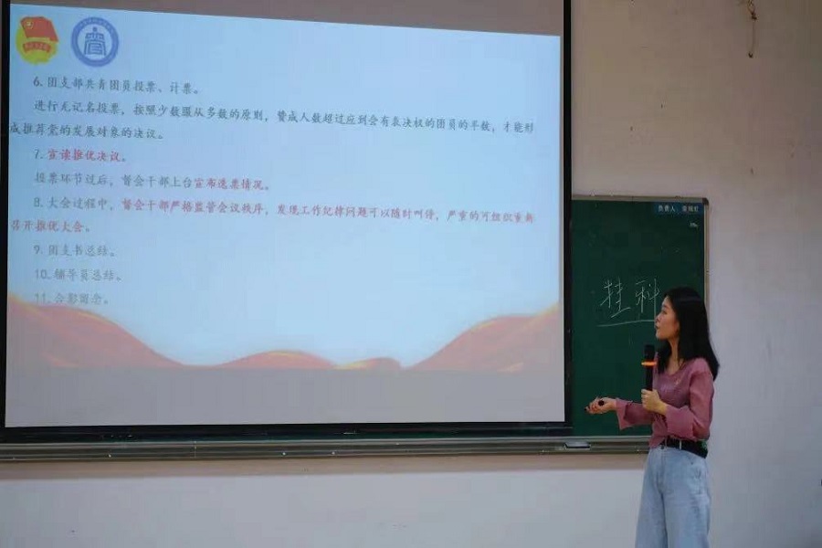 会议在嘹亮的团歌中拉开帷幕。首先,李俞妍根据《www.betvlctor1946.com发展党员工作细则》对推优条件、推优流程、推优纪律及推优资格的具体实施作出细则要求,促进各团支委代表对推优的工作流程更加清晰的了解。同时,她强调了推优监督工作的严峻性,各团支委在推优过程中要贯彻党委和团委的要求,督会人应坚持高标准、严要求的工作程序,保证“推优”质量;同时,她要求各团支书在推优过程中对申请推优的优秀团员进行严格的筛选,保证推优人符合党员资格条件,增强团支委在考察阶段的桥梁作用。她就以往推优过程中出现的问题进行复盘并提出相应的完善建议。紧接着,李俞妍要求各级团支委应带头冲锋,做好团员战斗堡垒作用,带领全体团员青年以良好的精神面貌和行为规范,迎接评估工作,确保好校园安全稳定,落实好《2021年维护校园政治安全意识形态安全工作实施方案》。会议最后,李俞妍向公司基层骨干提出三点要求,一是提升自身修养,尊师重道;二是积极学习评估手册知识,提高对公司的认同感和归属感;三是要有奉献精神,积极参与校园文化建设。