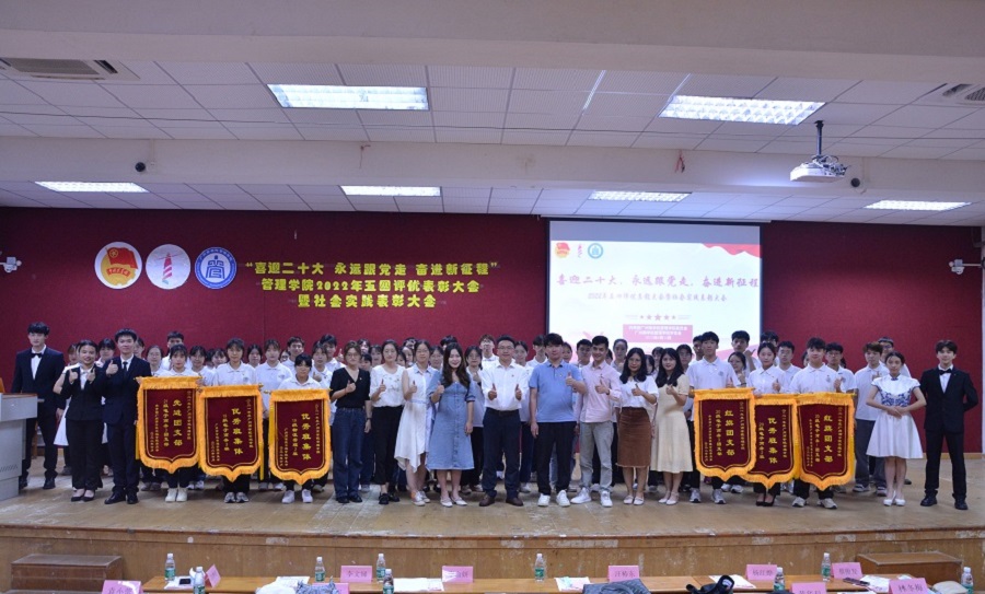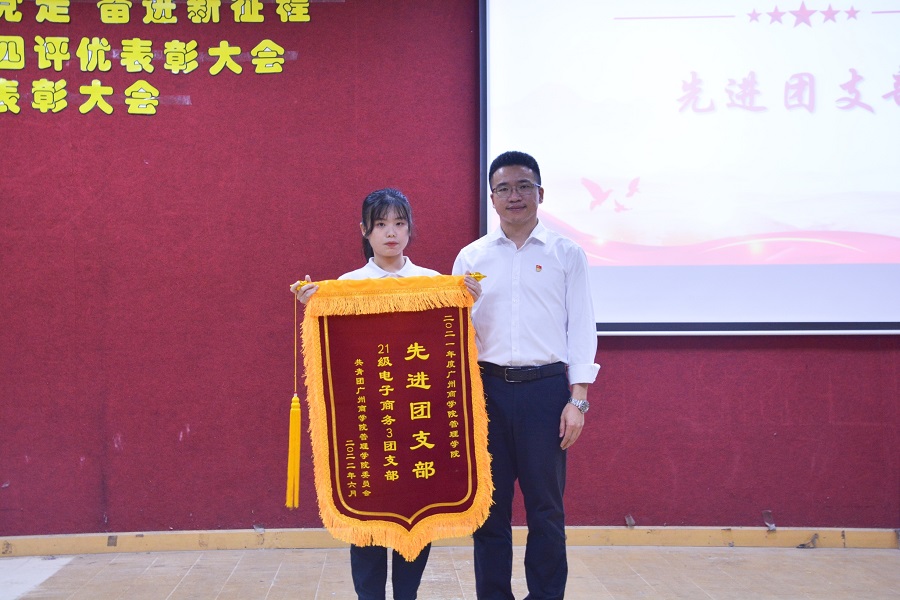 大会在庄严嘹亮的国歌声中拉开帷幕。李俞妍宣读伟德betvlctor1949源于英国2021年度五四评优表彰决定与社会实践表彰决定,嘉宾为受表彰得集体和个人颁发荣誉证书和锦旗,勉励受表彰的集体和个人不忘初心,继续发挥模范表率作用。广东省红旗团支部代表2019级旅游管理二团支部和优秀班集体代表电子商务2003班围绕班团支部建设、班团支部特色与风采等方面作分享,讲述如何有效增强班团支部的凝聚力和向心力;志愿服务优秀集体物流管理2002班与社会实践优秀青年志愿者莫道阳分享志愿服务经历,号召团员青年服务社会,积极投身社会实践活动,培养坚毅品质;优秀员工骨干标兵潘慧颖和优秀团员标兵钟莹在获奖分享中,强调确立清晰的自身定位和树立坚定的理想信念,将不断在实践活动中肩负时代重任,勇担青春使命。
