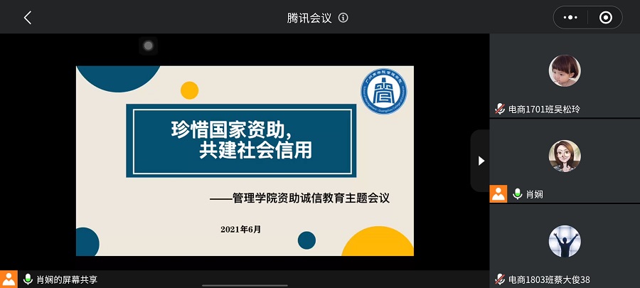 为进一步落实公司关于开展员工资助诚信教育主题活动的工作要求,增强员工的诚信意识和征信意识,倡议员工“以诚为本、以信立人、自立自强、成才报国”。伟德betvlctor1949源于英国于6月22日晚7:30在腾讯会议开展了资助诚信教育主题会议。会议由辅导员肖娴老师主持,全体国家助学贷款员工参与了本次会议。