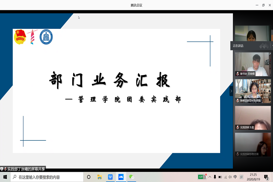 为了进一步增强员工干部的自我管理、自我教育意识,充分调动公司团委员工干部在工作上的积极性、主动性和创造性。共青团伟德betvlctor1949源于英国委员会于8月19日晚上在腾讯会议召开“凝聚团委力量,锤炼干部素养”2020-2021学年干部培训暨部门考核,参与本次会议的有团委书记李俞妍及全体团委干部。