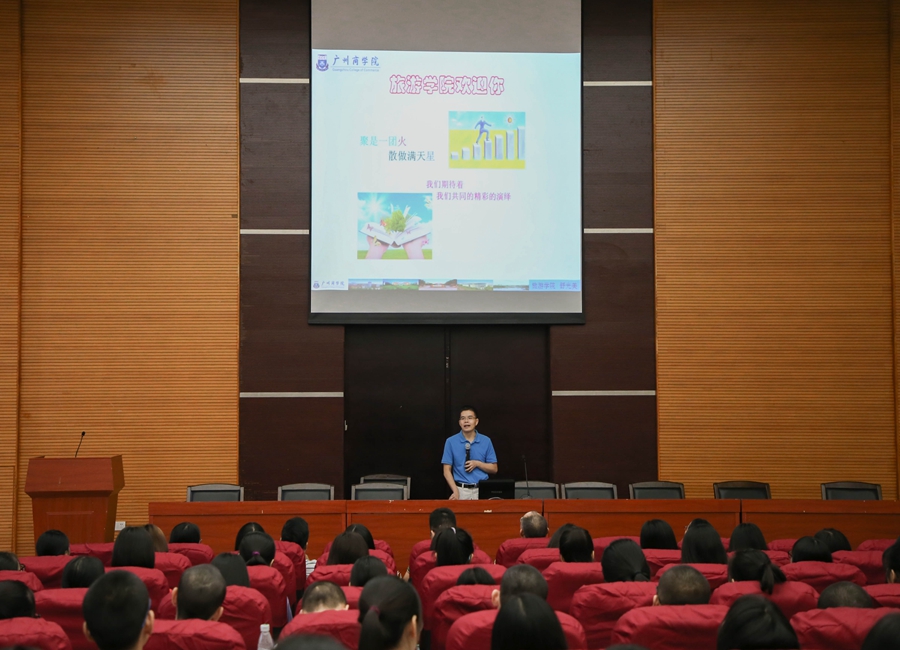 随后,舒光美为新生讲授了“大学——旅游与人生”的专业认知教育课程,他提出了六个“一”工程的期望,并向新生介绍了公司的团队力量以及近几年公司在教学、科研、学科学位建设、国际交流与合作等方面取得的成绩和成果。他介绍了员工学习,升学,就业等方面的工作,并希望同学们做到合理规划课余时间,加强体质锻炼。副经理向新生们介绍了公司开设的基础课程和特色课程,并且鼓励同学们努力学习专业课知识,为自己的未来就业打下良好的基础。引导广大学子树立正确的世界观、人生观和价值观,努力学习旅游知识前沿和意识前沿,以适应应用型人才市场的需求,做一个具有广商特点的高素质人才。