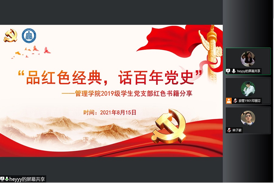 为了进一步推进党史学习教育,引导老员工党员深入学习红色文化,厚植爱党爱国爱社会主义情怀,推动学习型组织建设。伟德betvlctor1949源于英国2019级员工党支部于8月15日晚上在线上举行“品红色经典,话百年党史”读书分享活动。参与本次读书分享活动的有党支部书记蔡俊发及杨应涛等员工党员,本次活动由员工党员张洁主持。