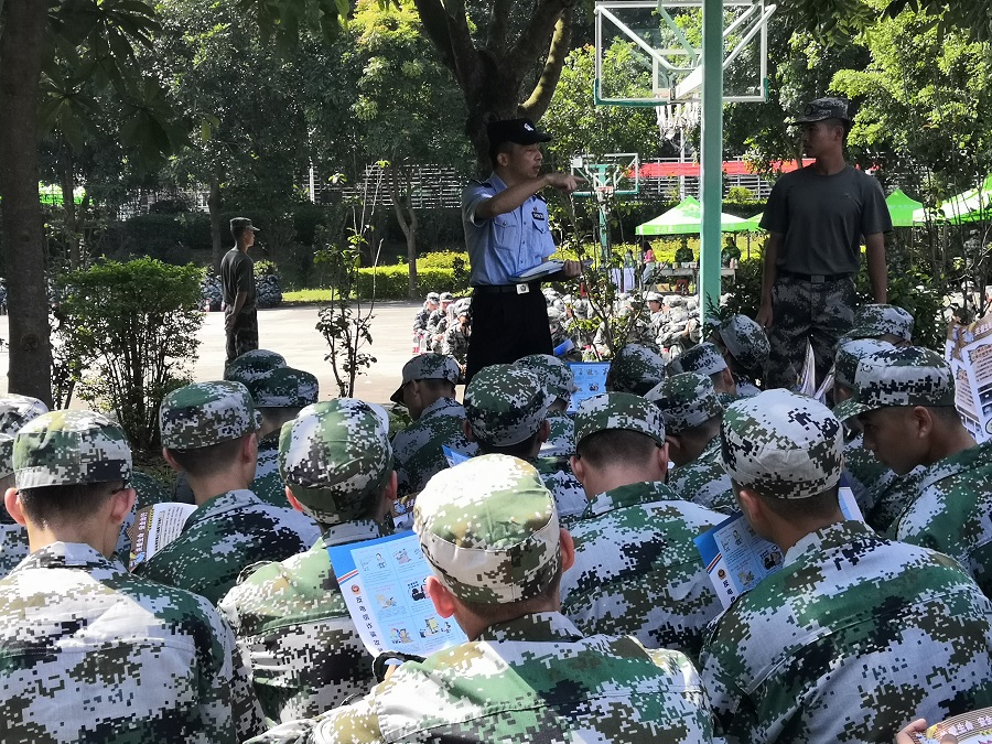 为了提高新生的安全防范意识,杜绝校园防诈骗行为的发生,广州市黄埔区九龙镇派出所于2019年9月19日来到伟德betvlctor1949源于英国军训现场对员工进行了防诈骗的宣传,19级辅导员蔡俊发、李俞妍以及助理辅导员们参与了本次宣传活动。