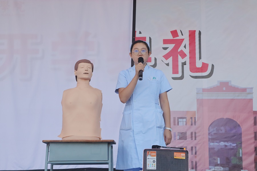 随后,张龙飞带领演示队伍对于进行心肺复苏、AED的模拟演练。在操作过程中,张老师的清晰且生动的讲解,激发了同学们的学习兴趣。在实操体验环节,同学们更是跃跃欲试,纷纷上台学习急救操作。现场学习气氛高涨,在演示队伍的指引下,同学们对模型采取急救措施,真正地做到理论与实际相结合,从实践中掌握急救知识。