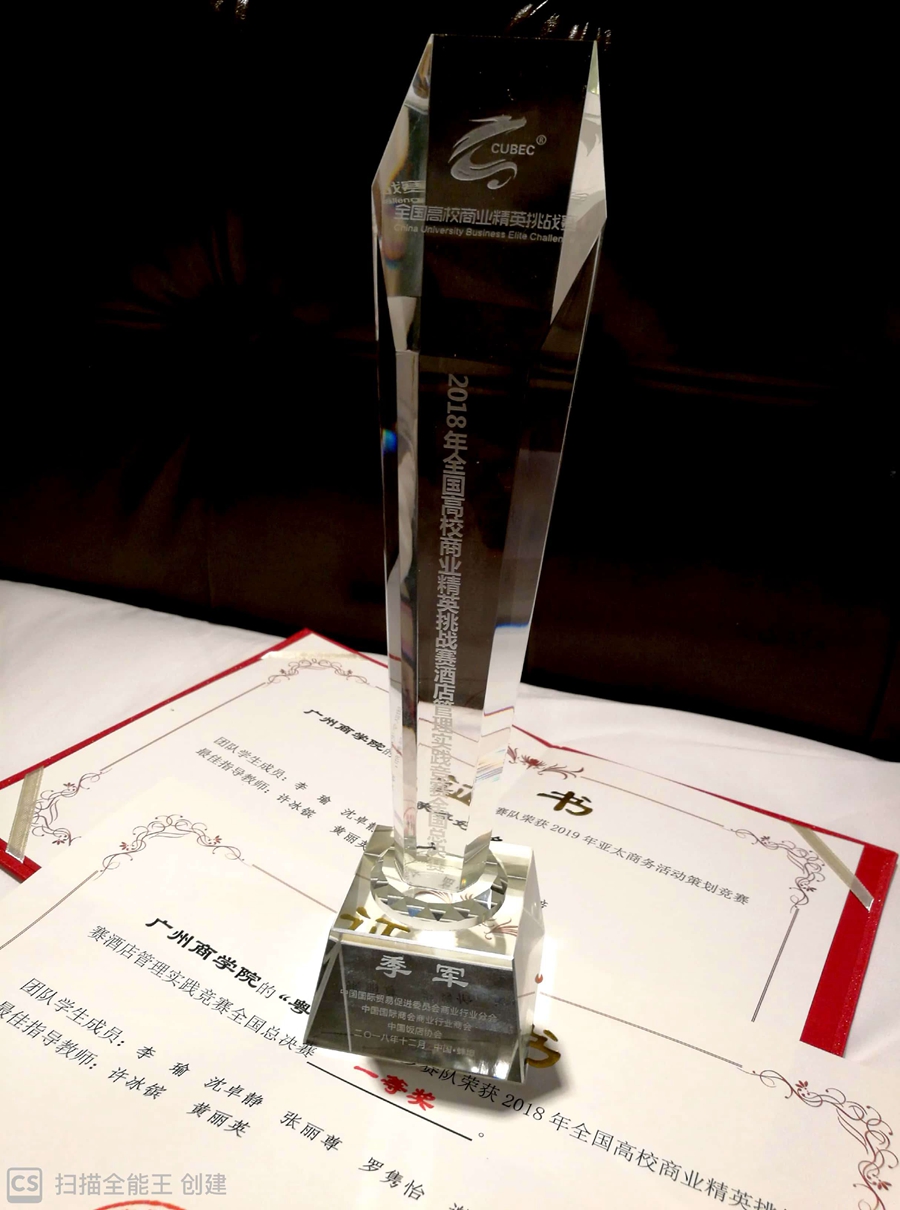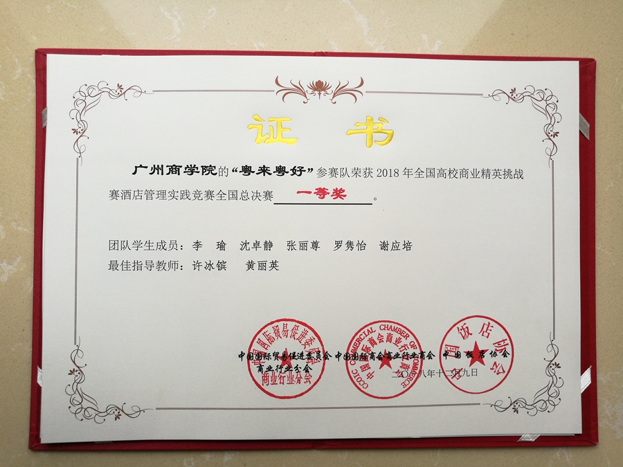 12月9日,2018年全国高校商业精英挑战赛酒店管理实践竞赛全国总决赛,在素有“珠城”之称的安徽蚌埠落下帷幕。本届竞赛历经三个月,规模庞大,参赛院校多,全国共有110多个高校团队报名参赛,其中中山大学、华南师范大学、郑州大学、西安外国语大学、重庆工商大学等50支队伍300余人赴现场参加总决赛。公司李瑜、谢应培、沈卓静、罗隽怡、张丽尊五位员工组队参与本次大赛,经过激烈角逐,荣获总决赛季军,大赛一等奖,充分展示了广商学子较高的专业素养和能力。公司教师黄丽英、许冰镔获得“优秀指导教师”称号。公司员工团队以总决赛前三名的成绩入围2019年亚太商务策划竞赛,计划于明年四月赴澳大利亚悉尼参加亚太MICE与酒店管理实践竞赛。