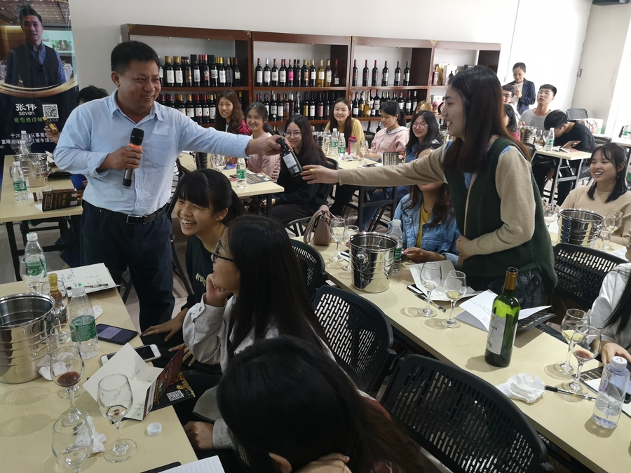 冯挺是第一堂课的主讲老师,现任广州欧中贸易有限公司总经理,连续十年从事葡萄酒进口、销售及文化推广工作,留学法国,曾访问西班牙、法国、德国等国葡萄酒庄园并学习葡萄酒知识,具有丰富的葡萄酒文化知识和企业管理经验。上午,冯挺主讲葡萄酒文化理论知识,包含了葡萄酒基础知识、历史与文化、主要种类、酿造过程、鉴别方法(含品酒)、餐酒搭配、影响葡萄酒价格的因素、如何看酒标以及世界主要葡萄酒店产区等内容。讲解细致,知识丰富,员工上课认真,互动良好。下午,江良、冯挺带领员工参观保税区 “红酒街”,此处共有五十多家葡萄酒企业落户,法国、西班牙、澳洲酒庄代表及企业老总热情与员工互动交流;员工参观后回到课堂,结合参观思考和体验,继续进行葡萄酒文化鉴赏实践课程。冯挺准备了各国代表性的葡萄酒,并从葡萄酒的选择、品尝葡萄酒的次序、餐酒搭配、酒品鉴别、不同国家葡萄酒店的特点等进行实践指导,员工受益匪浅。在提问环节,员工与老师积极互动,场面气氛热烈。