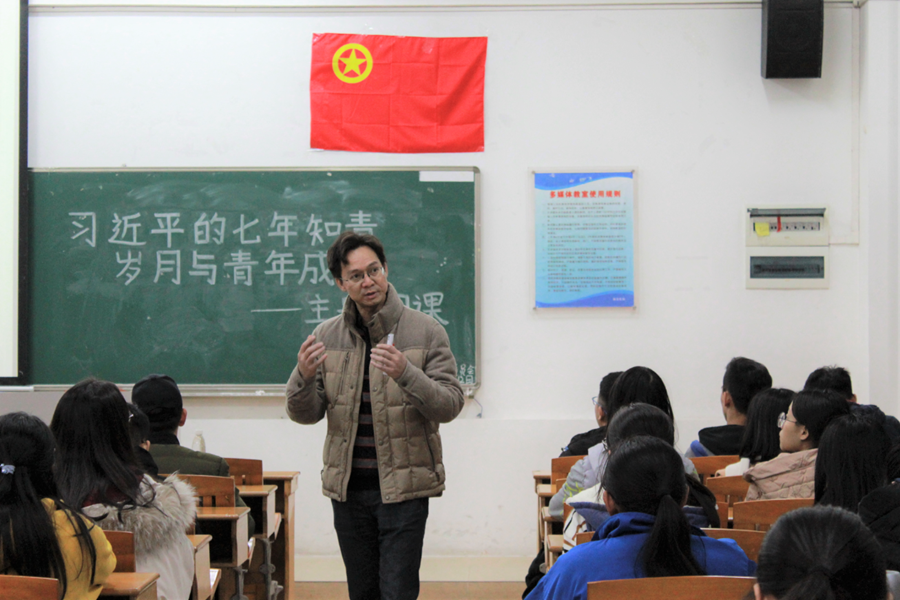 团课在奏唱团歌中拉开了帷幕,李锦堂提出网络上对于《习近平的七年知青岁月》的不同看法与观点,同学们应有独立思考,理性判断地看待问题,深究问题的真实性。接着是依次主要讲述了习近平在知青岁月时所经历的四个阶段,一是初到梁家河——厚积薄发;二是赵家河社教——初露锋芒;三是梁家河担任村支书——大展身手;四是上清华大学——天高任鸟飞,体现出习近平在知青岁月中的扎实与蜕变,成就不一样的人生。他表示读完全书“三个最”令人感动的瞬间是——年龄最小、地方最苦、时间最长”,体现出习近平的坚韧与锲而不舍,吃苦耐劳的品质,为日后的成功打下基础。更对启示中的“读书、目标、修身”等方面作了生动而详细的阐述,劝勉同学们需要懂得抓住事物的主要矛盾,抓住主要矛盾中的主要问题,掌握正确的理论知识。强调作为团员享受的权利的同时,应积极履行自身义务。勉励广大青年团员在今后的工作中,增强自我教育、自我管理和自我服务能力,实现自我发展,发挥团员榜样的作用。