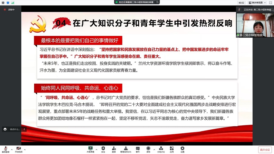 会议聚焦“第一议题”主题学习,张绮琪带领支部成员学习习近平总书记在省部级专题研讨班上的重要讲话精神,围绕“过去5年工作”和“新时代10年伟大变革”展开讲述,号召党员同志坚持以习近平新时代中国特色社会主义思想为指导,踔厉奋发,勇毅前行。党员同志热议习近平总书记在省部级主要领导干部专题研讨班上的重要讲话精神,表示通过学习习近平总书记的重要讲话精神,振奋人心、催人奋进,作为青年党员的我们应不忘初心、牢记使命,提高思想自觉、政治自觉和行动自觉,奋力走好新的赶考之路。