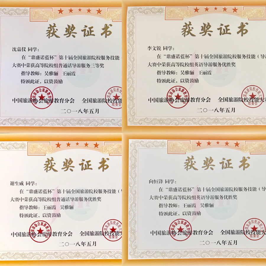 在黄立军经理等公司领导的支持下,公司将本次比赛与 “旅游文化月”的导游技能大赛对接,在全校范围内挑选优秀选手,通过层层选拔,最后确定四名选手参赛,公司最终派出吴雅骊、王丽霞两位老师作为指导老师,带领沈嘉仪、谢生威、李文锐、向恒锋四位选手积极备战国赛,比赛分为理论考试、导游词讲解、专题讲解以及才艺表演等模块,经过激烈比拼,公司沈嘉仪同学以86.97的总分获得“鼎盛诺蓝杯”第十届全国旅游院校服务技能(导游服务)大赛三等奖,谢生威、李文锐、向恒峰同学获得优胜奖。
