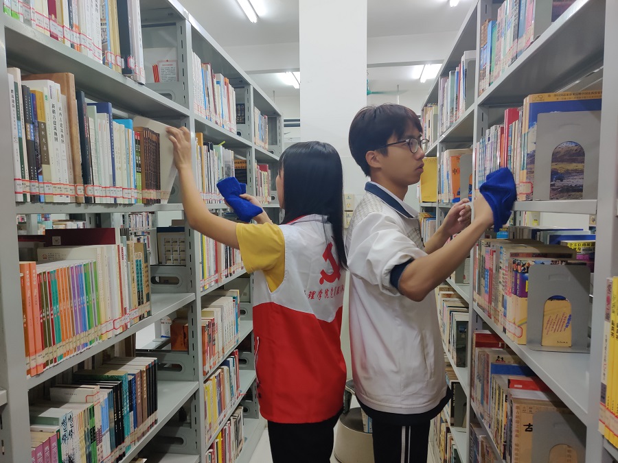 图书馆志愿服务活动时间为每周一、周四下午,每次由党员带领8位同学完成图书馆老师安排的各项工作,协助图书馆老师以及图学委干部进行不文明行为劝阻、整理书籍、整理书架、清洁书本及自习书桌等图书馆维护工作,为图书馆营造良好的学习阅读氛围。
