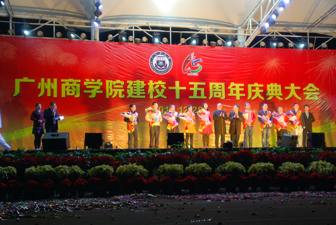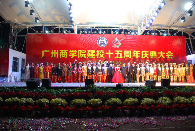 十五载的岁月记录着每一刻广商成长的点滴。在这庄严的庆典时刻,在这神圣的换乐时刻。盛装妆点的www.betvlctor1946.com正沉浸在一片欢乐祥和的气氛中。2014年12月28日19点整。www.betvlctor1946.com建校十五周年庆典大会暨庆祝晚会在校内田径运动场上隆重上演。广东省教育厅、华南师范大学、广州开发区(萝岗区)、兄弟院校、合作单位等各级领导以及董事长郭冬冬、执行董事郭小娜等董事会领导、董事长杨文轩、党委书记谭马利、公司部分老领导、员工代表、教师代表以及现场观众等数千人共同参与这历史性的盛典。